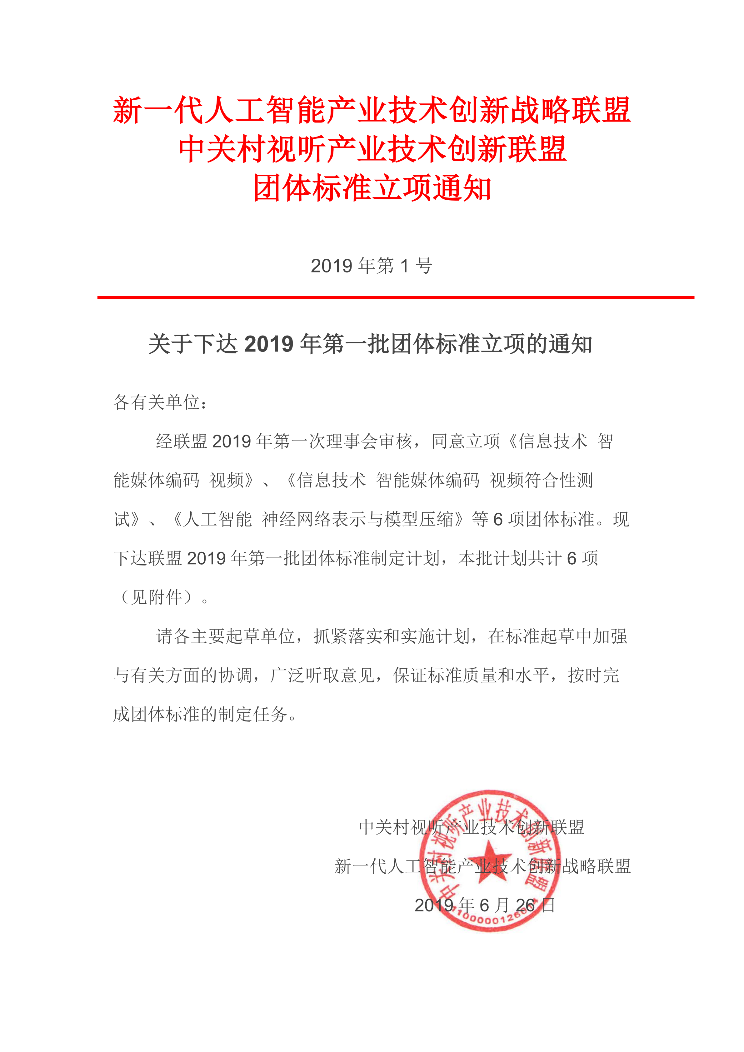 关于下达 2019 年第一批团体标准立项的通知